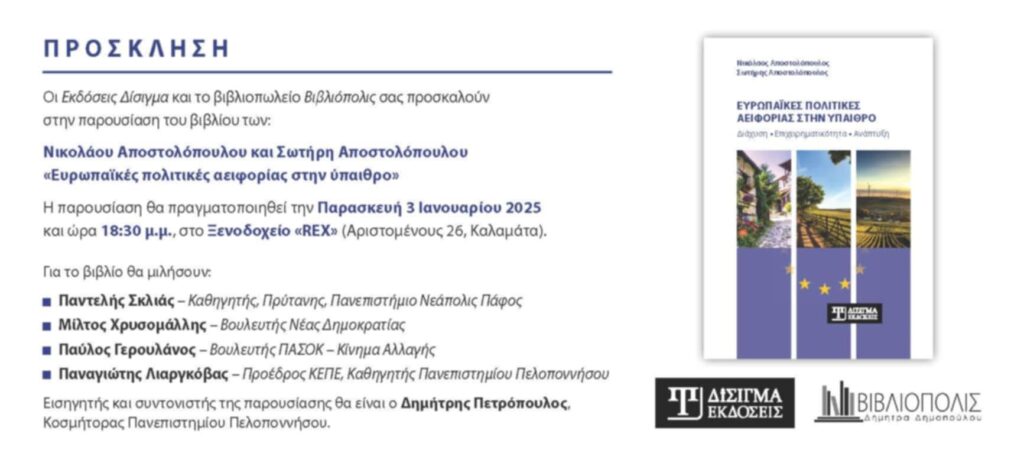 Αύριο στη Καλαμάτα η παρουσίαση του βιβλίου των Νίκου και Σωτήρη ΑποστολόπουλουPost author:TrifiliaTVPost published:2 Ιανουαρίου 2025Post category:Πρώτο θέμα / Τοπικά ΝέαPost comments:0 CommentsFacebookTweetEmail“ευρωπαϊκές πολιτικές αειφορίας στην ύπαιθρο”, αύριο 3 Ιανουαρίου, 18:30 στο ξενοδοχείο REX , στο κέντρο της ΚαλαμάταςFacebookTweetEmail You Might Also Like Άκης Γ. Κατρίτσης: Τριφυλία – Ώρα μηδέν28 Ιουλίου 2023 Παπανδρέου και Τσίπρας: Συνάντηση στην Μεσσηνία19 Αυγούστου 2024 Στο ψηφοδέλτιο του Γιώργου Λεβεντάκη, ο Πολυχρόνης Κουνάβης13 Φεβρουαρίου 2023Αφήστε μια απάντηση Ακύρωση απάντησηςCommentEnter your name or username to commentEnter your email address to commentEnter your website URL (optional) Αποθήκευσε το όνομά μου, email, και τον ιστότοπο μου σε αυτόν τον πλοηγό για την επόμενη φορά που θα σχολιάσω.